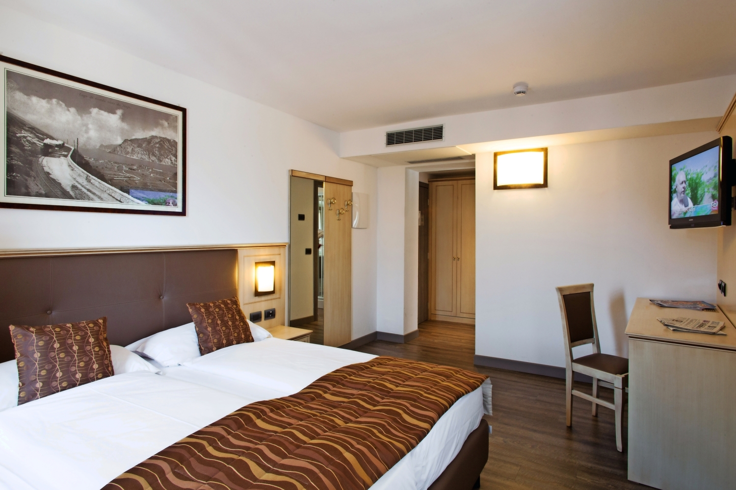 Zimmer: Die komfortablen Superior-Zimmer mit direktem bzw. seitlichem Blick zum Platz verfügen über Dusche/WC, Fön, Telefon, Sat.-TV, Safe, Minibar, WLAN-Anschluss und Klimaanlage (Mitte Juni bis Mitte September).